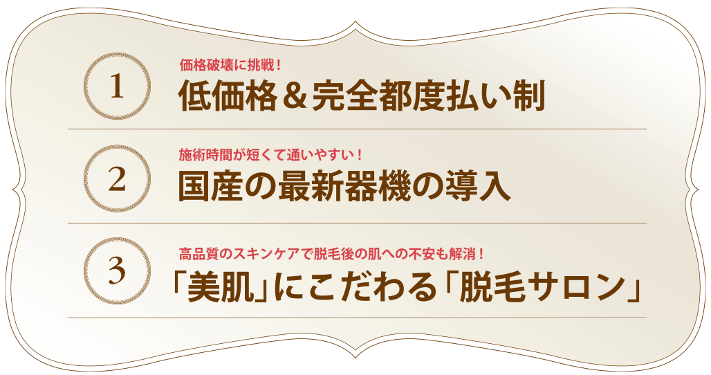 脱毛についてよくあるご質問「剃る」「抜く」といった自己処理と違い、確かな技術をもったエステティシャンと最新の国産美容機を使用しますので通い続けるうちにムダ毛の減りを実感いただけます。